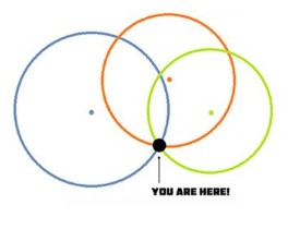 Nah, informasi jarak ini kemudian bisa dipakai untuk menentukan posisi receiver di bumi melalui teknik trilateration, yakni mencari titik persilangan di antara radius jarak tiga satelit GPS terdekat, seperti terlihat dalam gambar di samping. Di mana ketiga lingkaran jarak ini bertemu, di situlah posisi receiver.